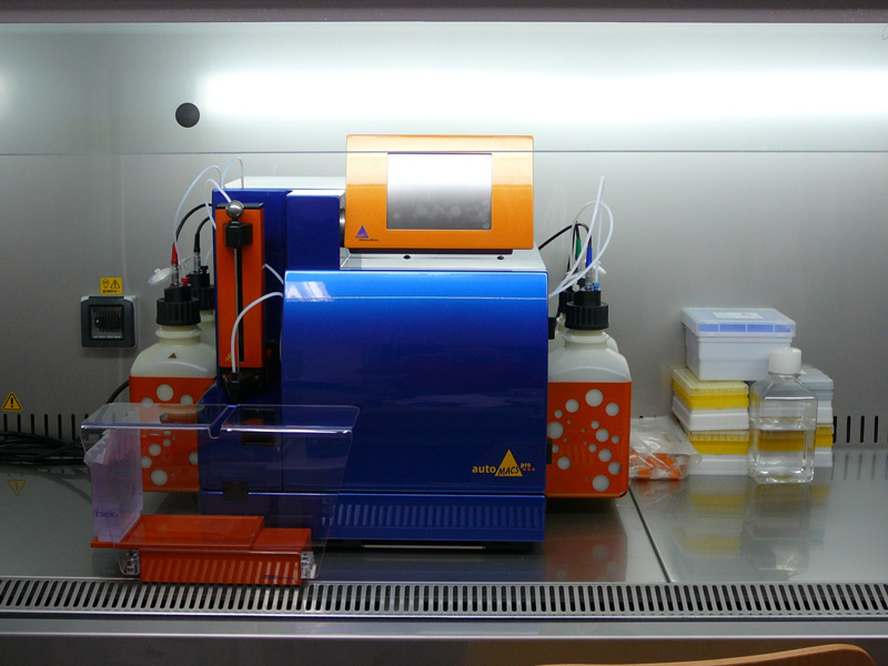AutoMACS pro-separator: an automated system for cell subsets purification based on immunomagnetic techniques. The instrument and the technology involved allow the isolation or enrichment of almost any type of cell, even from whole blood, using fully standardized procedures. Starting from 105 up to 109 of total cells in volumes going from 0.2 ml to 50 ml, this system allows the separation of up to 10 million cells per second. Moreover, there is the possibility to work with a large number of samples at the same time and to obtain from the same sample the desired positively selected population (or more), the depleted and untouched populations.